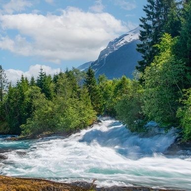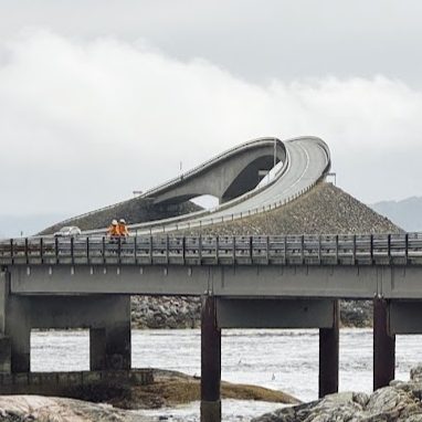 Wir fahren auf einer Panorama-Route Richtung Kristiansund. Steile Berge, zahlreiche Wasserfälle und wilde Stromschnellen befinden sich direkt an der Straße und laden zu Pausen ein.